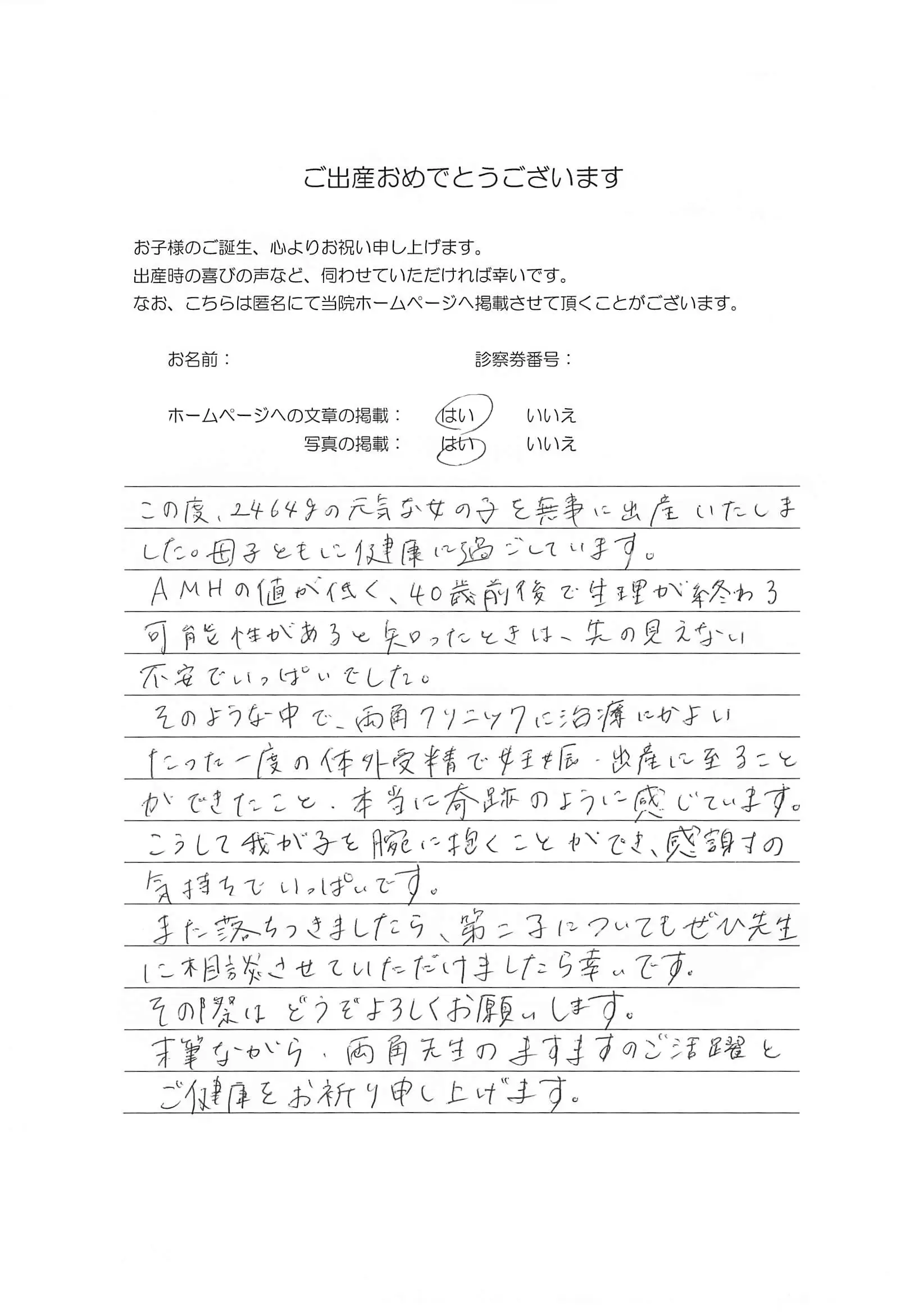 1.うまくいかない周期やお休みすることもあったり、不安が大きくなり精神的にも辛い日々を過ごすことがありましたが、この度、無事に出産できたのはこちらのクリニックで治療して頂けたおかげです。