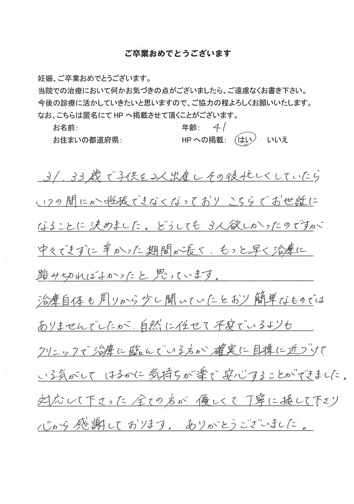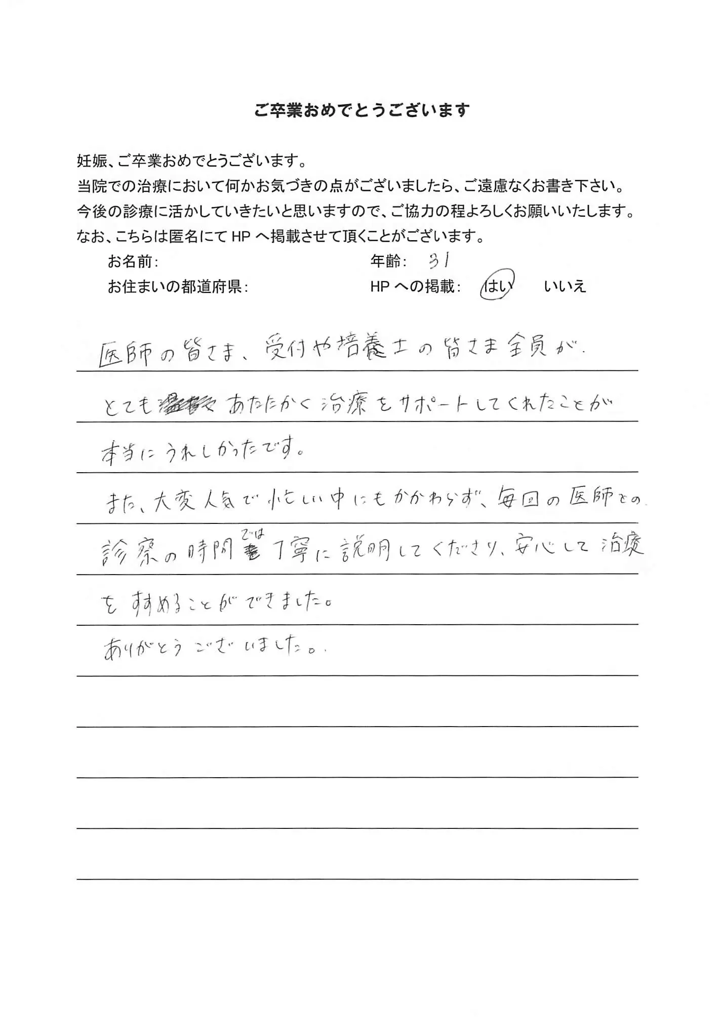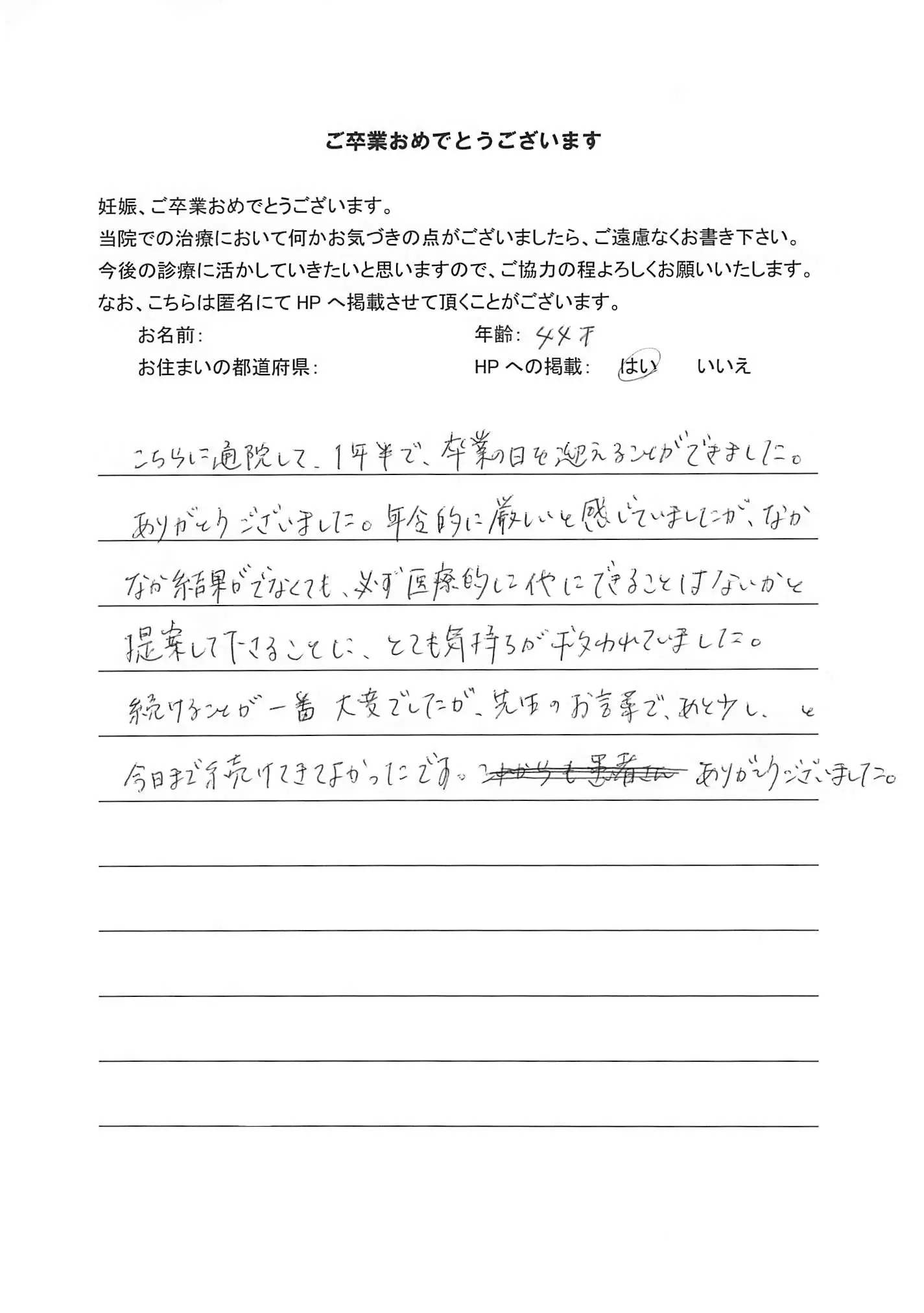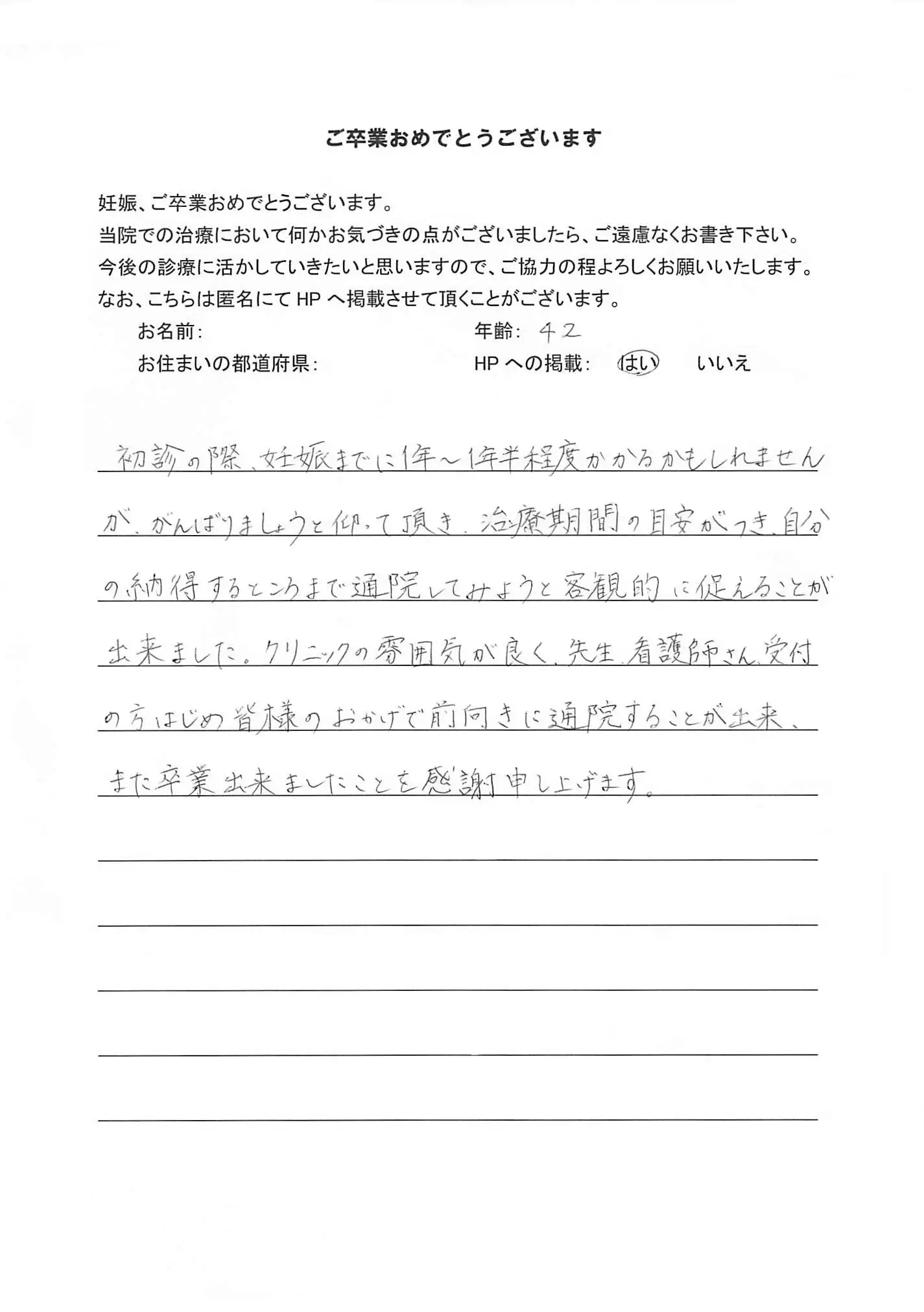 3.初診の際、妊娠までに1年~1年半程度かかるかもしれませんが、がんばりましょうと仰って頂き、治療期間の目安がつき、自分の納得するところまで通院してみようと客観的に捉えることが出来ました