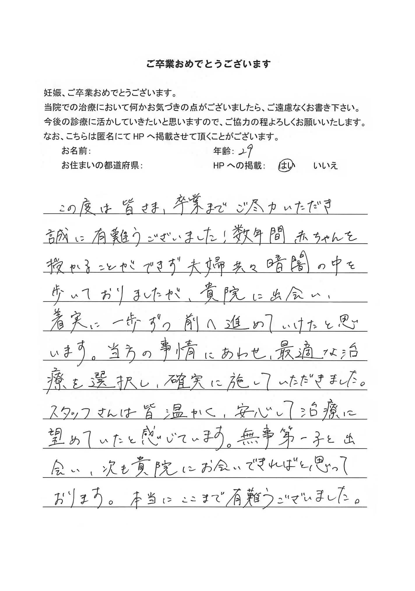 5.数年間赤ちゃんを授かることができず、夫婦共々暗闇の中を歩いておりましたが、貴院に出会い、着実に一歩ずつ前へ進めていけたと思います