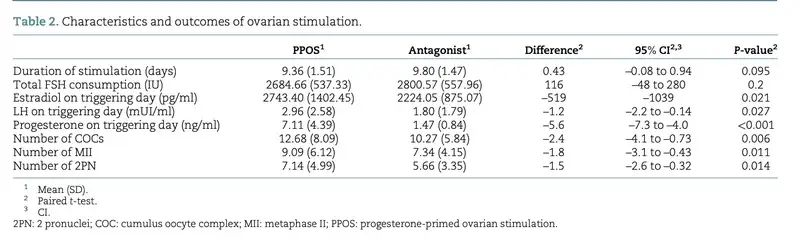 刺激の結果として最も分かりやすいのがTable 2(4ページ)です。データによると、採卵数、MII卵(成熟卵)数、受精卵数のすべてにおいて、PPOS法の方が有意に多いという結果が出ました。卵巣の反応性という観点では、PPOS法はアンタゴニスト法と同等か、それ以上に効率的である可能性を示唆しています。