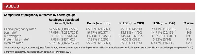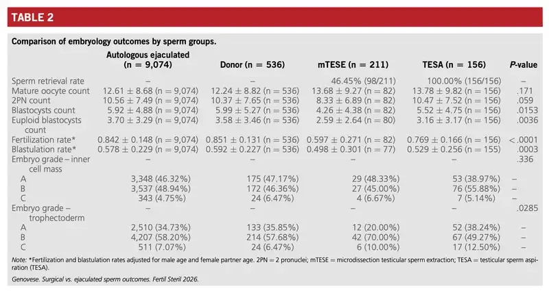 出典:Embryological outcomes of using surgical sperm in obstructive and nonobstructive azoospermia compared with ejaculated sperm. Fertility and Sterility, 2026年, 125巻4号, 632–639.