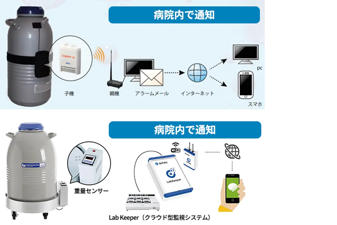 「Logbee Cool」はタンク表面の温度を常時監視し、真空漏れなどの重大事故をメールで即時通知します。「NLO」は液体窒素の重量を感知し、残量低下や容器の不具合をクラウドシステム「Lab Keeper」を通じて監視・通知します。