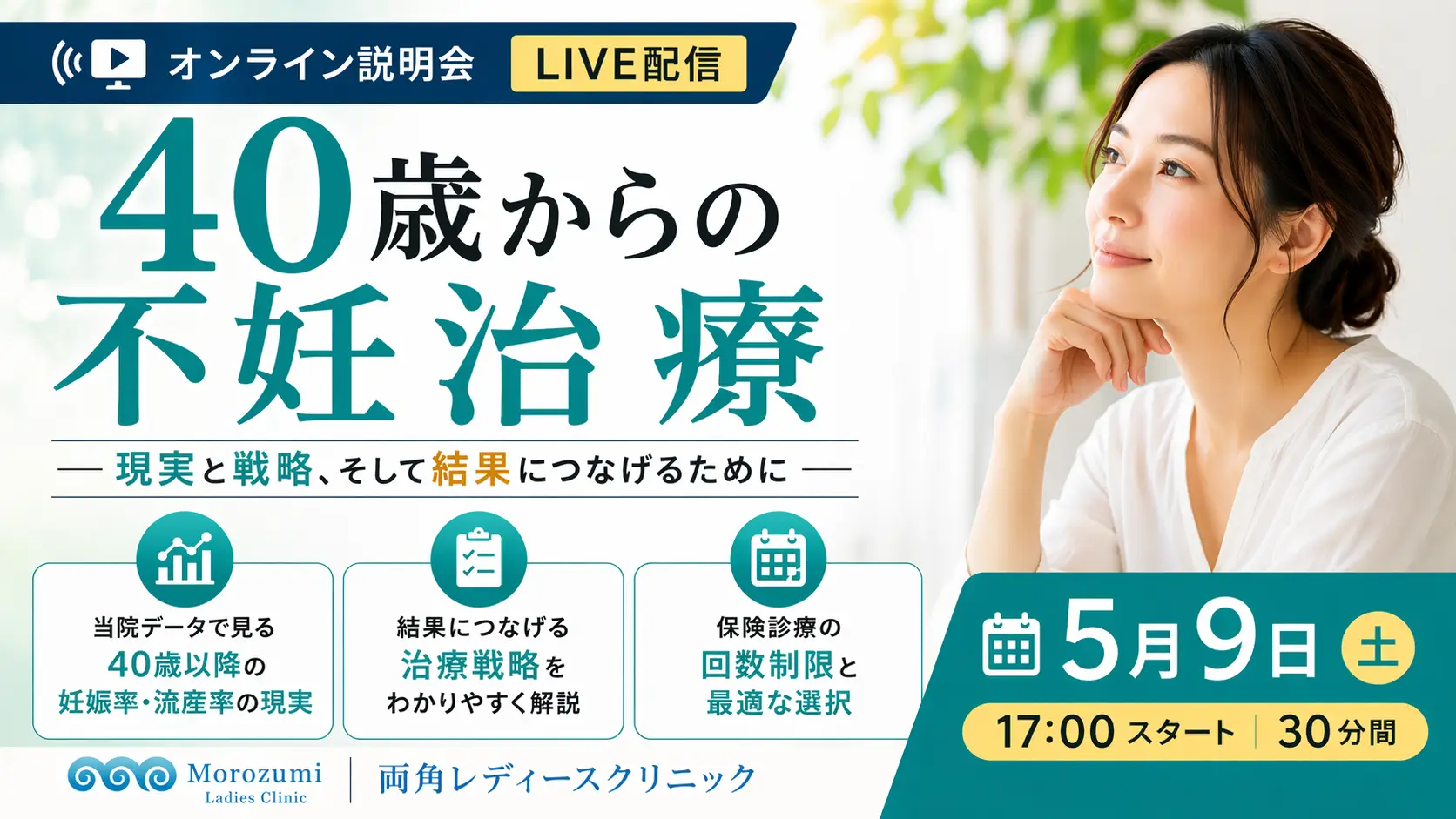 | イベント名 | 5/9(土)『40歳からの不妊治療』オンラインセミナー開催のお知らせ |
